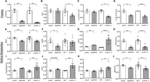 mthfr deficiency in zebrafish reduces folates and alters 1-carbon cycle methyl metabolites. Relative concentrations of whole-body (A–D) folates and (E–L) related 1-carbon metabolites in zebrafish larvae at 5 dpf. Comparisons were conducted between cas9 versus 4gRNA mthfr crispants (4gRNA) or age-matched WT controls versus mthfr −/− mutants (mthfr −/−, HSC194). Values are mean ± SEM, n = 3–4 biological replicates of pooled zebrafish/group. Each pool was composed of n = 40 larvae for folates and n = 20 larvae for methyl metabolites for cas9 versus 4gRNA mthfr crispants and n = 50 larvae for folates and n = 30 larvae for methyl metabolites for WT versus mthfr −/− mutants. No differences in pooled weight were observed. Analyzed by Student’s t-test stratified by mutagenesis approach. Significant at *P < 0.05, **P < 0.01, ***P < 0.0001. Abbreviations: tHcy, total homocysteine; 5,10-CH-THF, 5,10-methenyltetrahydrofolate; 5,10-CH2-THF, 5,10-methylenetetrahydrofolate. |