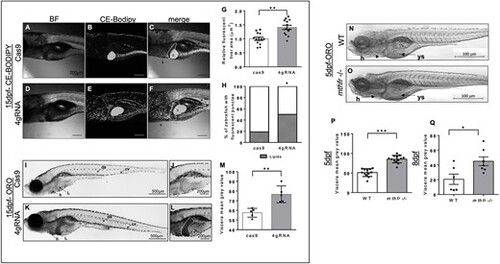 Lipid accumulation is greater in mthfr zebrafish compared with controls. (A–F) Representative bright field (BF) and fluorescent confocal images of (A–C) cas9 control (cas9) and (D–F) 4gRNA mthfr crispants (4gRNA) fed a 4% HCD with ce-BoDipy-C12® from 5 to 15 dpf. Fluorescent liver area is outlined by a white dotted line and green fluorescence represents CEs. 10× magnification, scale bar = 200 μm. (G) Relative fluorescent liver area and (H) percentage of larvae with excess circulating lipids were compared between cas9 and 4gRNA zebrafish. n = 13–18 larvae/group. Analyzed by one-way ANCOVA with ‘batch’ as a covariate. Significance at *P < 0.05. (I–L) Representative bright-field images of (I, J) cas9 and (K, L) 4gRNA zebrafish stained with ORO at 15 dpf following 10 days of HCD feeding. White dotted line outlines liver area. 20× magnification, scale bar = 500 μm for images I and K and 40× magnification, scale bar = 200 μm for panels J and L. (M) Calculated mean gray area of viscera region at 15 dpf. n = 4–5 larvae/group. Analyzed by Student’s t-test. Significance at *P < 0.05, **P < 0.01. (N, O) Representative BF images of WT controls and 5-methylenetrahydrofolate reductase homozygous KO germline zebrafish mutants (mthfr −/−, HSC194) at 5 dpf stained with ORO. 20× magnification, scale bar = 500 μm. Calculated mean gray area of viscera region at (P) 5 dpf and (Q) 8 dpf. n = 12–13 larvae/group. Analyzed by one-way ANCOVA with ‘batch’ as a covariate. Significance at *P < 0.05 and ***P < 0.0001. Letters and arrows show areas of interest: h, heart; da, dorsal artery; isv, intersegmental area; pcv, posterior cardinal vein; ys, yolk syncytial layer; L, liver; g, gallbladder; i, intestine. All values are mean ± SEM. Circles represent one individual zebrafish from batch 1 and squares represent zebrafish from batch 2. |