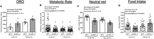 FA dose and mthfr genotype interact to affect metabolic outcomes. (A) Calculated mean gray area of viscera region at 5 dpf in WT and mthfr −/− mutants (mthfr −/−, HSC194) exposed to either 0 or 100 mm FA from 0 to 5 dpf and stained with ORO. (B) Relative metabolic rate at 5 dpf of WT and mthfr −/− exposed to either 0 or 100 mm FA from 0 to 5 dpf. (C) Number of NR+ cells at 4 dpf WT and mthfr −/− exposed to either 0 or 100 mm FA from 0 to 4 dpf. (D) Relative food intake, measured by CTCF, at 5 dpf in WT and mthfr −/− exposed to either 0 or 100 mm FA from 0 to 5 dpf. All values are mean ± SEM. Analyzed by two-way ANOVA with FA dose (0 versus 100 mm) and mthfr genotype (WT versus mthfr −/−) as main factors and a Dose × Genotype interaction term. Significant at P < 0.05. Values in bold indicate significant effects. Circles represent one individual zebrafish from batch 1 and squares represent zebrafish from batch 2. |