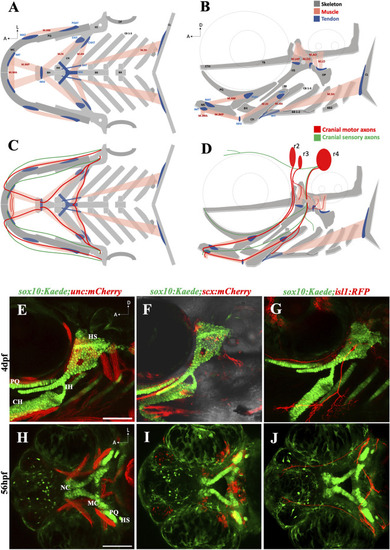 The zebrafish head has a complex anatomical organization (A, B) Schematics showing arrangement of craniofacial skeleton, muscle, and tendon in ventral and lateral planes (adapted from Schilling and Kimmel, 1997). (C, D) Schematics showing cranial nerves originating from rhombomere (r) 2, 3 & 4 innervating the branchial muscles in ventral and lateral planes. (E) 4dpf sox10:Kaede;unc:mCherry double transgenic fish showing musculoskeletal arrangement laterally. (F) 4dpf sox10:Kaede;scx:mCherry double transgenic fish showing tendons and cartilage laterally. (G) 4dpf sox10:Kaede;isl1:RFP double transgenic fish showing branchiomotor neurons and cartilage laterally. (H–J) Ventral view of developing zebrafish head at 56hpf showing craniofacial cartilage, muscle, tendons, and motor neurons emerge and integrate around the same developmental window. A (anterior), D (dorsal) L (lateral). r (rhombomere). Skeleton (grey)—BB (basibranchial), BH (basihyal), CB (ceratobranchial), CH (ceratohyal), CL (cleithrum), ETH (ethmoid), TB (trabecula), HH (hypohyal), HS (hyosymplectic), MC (Meckel’s cartilage), OP (opercle), PQ (palatoquadrate). Tendon (blue)—CHHT (ceratohyal hyohyoideus tendon), CHIT (ceratohyal interhyoideus tendon), HHJ (hyohyal junction), IMT (intermandibular tendon), MAT (Meckel’s adductor tendon), MHJ (mylohyoid junction), PQAT (palatoquadrate adductor tendon), SHT (sternohyoideus tendon). Muscle (pink)—M.AM (adductor mandibularis muscle), M. AO (adductor operculi muscle), M. DO (dilator operculi muscle), M. HH (hyohyoideus muscle), M. IH (interhyoideus muscle), M. IMA (Intermandibularis anterior muscle), M. IMP (Intermandibularis posterior muscle), M. LAP (levator arcus palatini muscle), M. LO (levator operculi muscle), M. SH (sternohyoideus muscle). Scale bar = 100 um. |