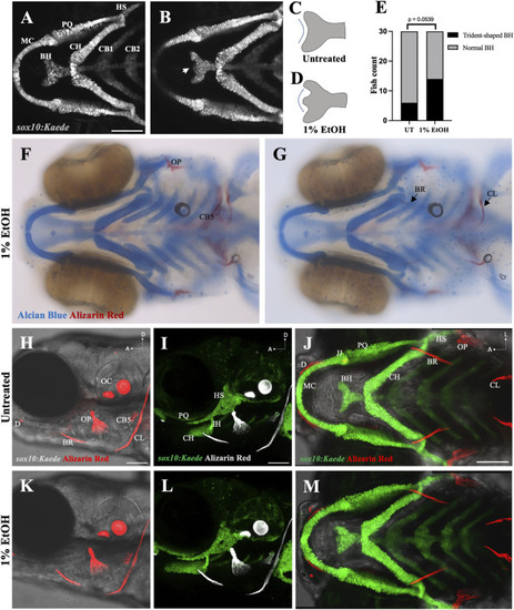 Ethanol can have mild effects on the shape of the basihyal cartilage (A) Ventral view of branchial cartilages in untreated (UT) sox10:Kaede fish at 4dpf. (B) Ventral view of branchial cartilages in ethanol (EtOH)-exposed sox10:Kaede fish at 4dpf showing trident-shaped basihyal (indicated by an arrow). (C, D) Schematics showing basihyal shape in untreated (C) and ethanol-exposed fish (D). (E) Number of fish with trident-shaped basihyal increase in the ethanol-exposed group. (F, G) Alcian and alizarin-stained, ethanol-exposed viscerocranium showing normal ossification at 4dpf in AB fish. (H–J) Live alizarin-stained untreated sox10:Kaede fish at 4dpf. (K–M) Live alizarin-stained sox10:Kaede, ethanol-exposed fish at 4dpf showing no ossification defects. BR (branchiostegal ray), CB5 (ceratobranchial 5), CL (cleithrum), D (dentary), JJ (jaw joint), OC (otic capsule), OP (opercle). Scale bar = 100 um. |