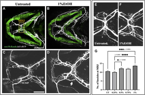 Ethanol induces cranial nerve defasciculation (A, B) Untreated and ethanol-exposed sox10:Kaede;isl1:RFP fish. Scale bar = 100 um. (C, D) Magnified view of motor innervations in Intermandibularis anterior (M.IMA), Intermandibularis posterior (M.IMP) and Interhyoideus muscles (M.IH) in untreated and ethanol-exposed fish. Scale bar = 50 um. Arrow in D indicates defasciculated exons around MHJ (mylohyoid junction). (E, F) High-resolution images of MHJ region in untreated and ethanol-exposed fish. (G) Number of fascicles at MHJ significantly increase in fish exposed to 1% ethanol.* = p < 0.05; *** = p < 0.001; **** = p < 0.0001. |