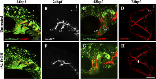 Ethanol does not affect early cranial nerve routing and pathfinding (A, B) Trigeminal nerve (n.V) and facial nerve (n.VII) extending towards BA (branchial arch)1 and BA2 in untreated sox10:Kaede;isl1:RFP embryo at 24hpf. (E, F) Normal extension of n. V and n. VII in ethanol-exposed sox10:Kaede;isl1:RFP embryos at 24hpf. (C, G) Untreated and ethanol-exposed sox10:Kaede;isl1:RFP fish at 48hpf. (D, H) Untreated and ethanol-exposed isl1:RFP fish at 72hpf. Arrow in H shows an extending ectopic nerve along the midline in ethanol-exposed fish. Scale bar = 100 um. |