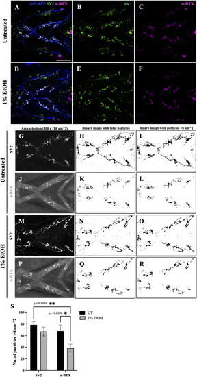 Number of postsynaptic receptors are reduced in ethanol-exposed fish (A–F) Immunostained neuromuscular junctions (NMJs) composed of presynaptic terminals (labeled with SV2) and postsynaptic acetylcholine receptors (labeled with α-BTX) in untreated (A–C) and ethanol-exposed (D–F)isl1:RFP fish. A and D are merged images with motor neurons (in blue), SV2 (in green) and α-BTX (in magenta). (G–R) Quantification of presynaptic and postsynaptic terminals in untreated (G–L) and ethanol-exposed (M–R) fish. NMJs were counted for Intermandibularis anterior, Intermandibularis posterior and Interhyal muscles by selecting an area of 300x180 um^2 as shown in G, J, M and P. H, K, N and Q show total number of particles after segmentation. I, L, O and R show particles with sizes greater than 8-micron square. (S) Number of α-BTX labeled particles >8 um^2 significantly reduced in ethanol-exposed fish. There was no significant change in the number of SV2 labeled particles. * = p < 0.05; ** = p < 0.01. Scale bar = 100 um. |