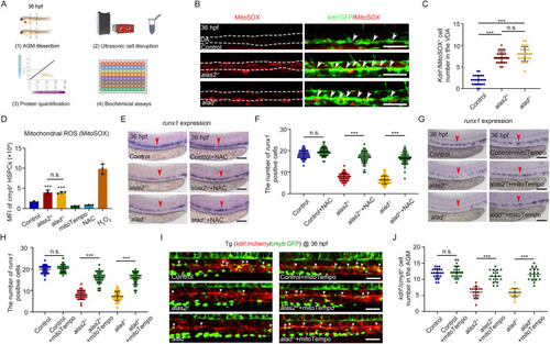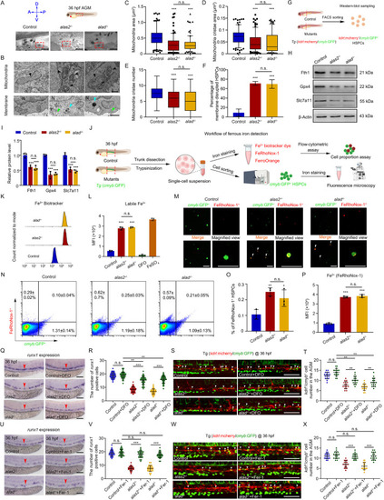 Iron-dependent HSPC ferroptosis in alas2−/− and alad−/−. (A) Transmission electron microscopy (TEM) view of a longitudinal section through the artery and vein in control, alas2−/− and alad−/− AGM region at 36 hpf. (B) TEM view of HSPC subcellular structures. From top to bottom panels are mitochondria and membrane. Arrowheads in black denote mitochondria, green denote plasma membrane and blue denote double-membrane vesicle. (C-E) Quantification of mitochondria area, mitochondria cristae area and cristae number in HSPCs of control, alas2−/− and alad−/−. Box plots show median values (middle bars) and first to third interquartile ranges (boxes); whiskers indicate 1.5 times the interquartile ranges (IQR); individual points from the 10 to 90 percentile are plotted and shown. n (mitochondria)=96. (F) Quantification of membrane-disrupted HSPCs in control, alas2−/− and alad−/−. n (HSPCs)=12. (G,H) Western-blotting detection of the protein level of Fth1, Gpx4 and Slc7a11 in flow cytometric-sorted HSPCs of control, alas2−/− and alad−/− at 36 hpf, respectively (30,000 HSPCs were sorted in each group). (I) Quantification of protein levels in H. Protein levels were analyzed using 8-bit-gray analysis (Gel-Pro analyzer). n=3 experimental replicates. (J) Schematic workflow for the ferrous iron assessment in HSPCs (cmyb+) of alas2−/− and alad−/− with fluorescent iron probes (Fe2+ biotracker dye, FeRhoNox-1 and FerroOrange) at 36 hpf. (K) Representative flow cytometric histogram of the Fe2+ level in sorted HSPCs of control, alas2−/− and alad−/− at 36 hpf measured by Fe2+ biotracker dye. (L) Quantification of mean fluorescence intensity (MFI) of labile Fe2+ level in K. (M) Representative fluorescence images show the co-localization of cmyb:GFP+ and FeRhoNox-1+ cells in alas2−/− and alad−/− at 36 hpf. The cmyb+/FeRhoNox-1+ cells are denoted by white arrowheads. (N) Flow cytometric analysis of the percentage of cmyb+/FeRhoNox-1+ cells in control, alas2−/− and alad−/− at 36 hpf. (O) Statistical analysis of the percentage of FeRhoNox-1+ HSPCs in N. n=3 experimental replicates. (P) Quantification of MFI of Fe2+ level in N. n=3 experimental replicates. (Q) Expression of HSPC marker runx1 in control, alas2−/− and alad−/− with or without DFO treatment (100 μM) at 36 hpf examined by WISH. The AGM regions for marker gene-positive cell counting are denoted by red arrowheads. (R) Quantification of the runx1-positive HSPCs in Q. n=3 experimental replicates. (S) Confocal imaging shows the kdrl+/cmyb+ HSPCs in control, alas2−/− and alad−/− with or without DFO treatment at 36 hpf. (T) Quantification of the HSPCs in S. n=3 experimental replicates. (U) Expression of HSPC marker runx1 in control, alas2−/− and alad−/− with or without Ferrostatin-1 (Fer-1) treatment (10 μM) at 36 hpf examined by WISH. The AGM regions for marker gene-positive cell counting are denoted by red arrowheads. (V) Quantification of the runx1-positive HSPCs in U. n=3 experimental replicates. (W) Confocal imaging shows the kdrl+/cmyb+ HSPCs in control, alas2−/− and alad−/− with or without Fer-1 treatment at 36 hpf. (X) Quantification of the HSPCs in W. n=3 experimental replicates. Number of samples are indicated. Data are mean±s.d. *P<0.05, **P<0.01, ***P<0.001 [one-way ANOVA, Tukey's multiple comparisons (C-F,L,O,P,R,T,V,X); two-way ANOVA, Sidak's multiple comparisons (I)]. n.s., not significant. Scale bars: 10 μm (A); 0.5 μm (B); 50 μm (M); 100 μm (Q,S,U,W).