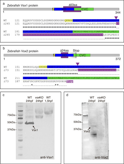 (a, b). Scheme of zebrafish Vsx1 and Vsx2 peptides and protein alignments showing the nuclear localization signal (N, yellow), homeodomain (HD, blue) and CVC (green) regions. The starting of the mutation induced by CRISPR/Cas9 is indicated by a purple arrowhead. (a). The in-frame 53 amino acid deleted region in the vsx1 mutant is depicted by a purple color in the upper scheme and in the bottom protein alignment. (b). The 24 amino acid deleted region in the vsx2 mutant is depicted by a purple color in the upper scheme followed by a graded grey box indicating the frame-shift in the sequence and the premature stop codon generated in the CVC domain. Important to note is that the deletion in vsx2 comprised conserved critical amino acids that have been identified as causative mutations both in mice (ocular retardation model) and microphthalmic patients (R200Q/P and R227W mutations). (c). Western blot representative image using an anti-Vsx1 antibody showing the WT Vsx1 protein (black arrow). Note that Vsx1 protein is not detected either in vsxKO at 24hpf (middle lane) or in early (1.5hpf) wildtype embryos (right lane). (d). Western blot representative image using an anti-Vsx2 antibody showing the WT Vsx2 protein at 24hpf (black arrow). No Vsx2 protein is detectable in vsxKO heads at 24hpf. |