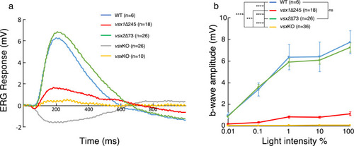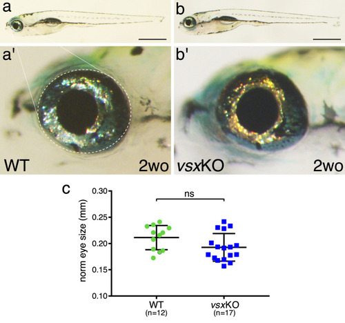 (a, b). Lateral view of a 2-week-old wildtype (a) and vsxKO (b) fish. Note that vsxKO juvenile fish show no obvious morphological differences with wildtype siblings. (a', b'). High-magnification images from wildtype ( |