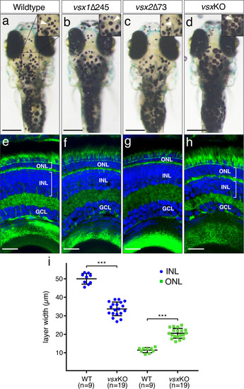 (a-d). Dorsal view of wildtype (a), vsx1∆245 (b), vsx2∆73 (c), and vsxKO (d) animals at 6dpf. vsx1∆245 (b) and vsxKO (d) fish have problems sensing background light and appear darker than wildtype (a) and vsx2∆73 (c) larvae, as melanosomes are broadly distributed within melanophores (white arrowheads). (e-h). Histological sections of wildtype (e), vsx1∆245 (f), vsx2∆73 (g), and vsxKO (h) eyes at 6dpf. In the central retina of vsxKO double mutants (h), the INL width is reduced and the ONL thickness is expanded compared to wildtype (e), vsx1∆245 (f), or vsx2∆73 (g) samples. DAPI and phalloidin coupled to Alexa488 were used as nuclear and cytoskeletal (actin) markers, respectively. (i). Quantification of INL (blue circles) and ONL (green squares) width in central retinas at 6dpf using histological sections as in (e-h) panels. Significant reduction and expansion of the INL and ONL, respectively, was observed in vsxKO retinas when compared to wildtype (***p<0.0001) using an unpaired t-test. Data are shown as mean ± SD. ONL: outer nuclear layer, INL: inner nuclear layer, GCL: ganglion cell layer, µm: micrometres. Scale bar in (a-d): 500µm, scale bar in (e-h): 20µm. |