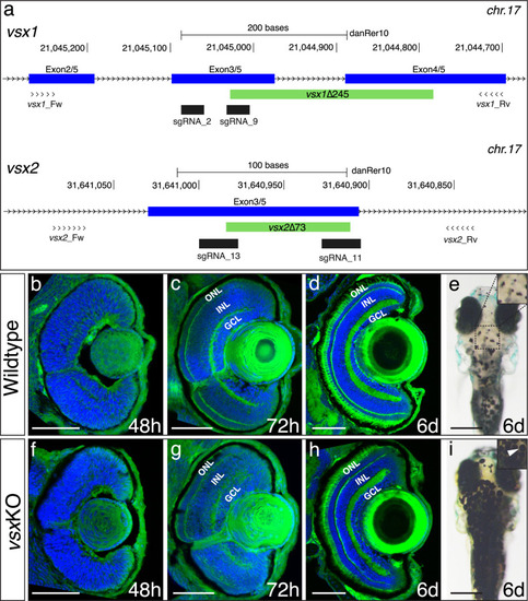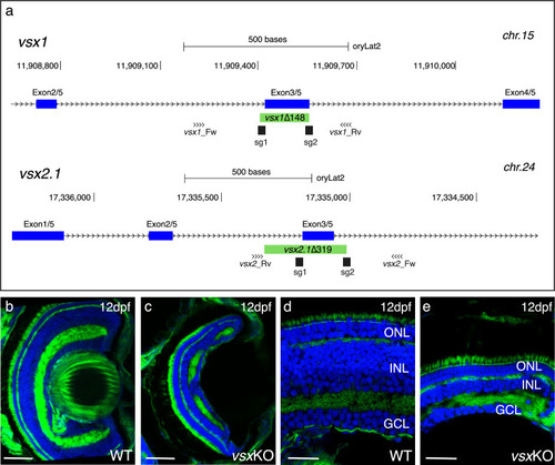 (a) CRISPR/Cas9 was used to eliminate (green box) the DBD from vsx1 (top) and vsx2.1 (bottom) TFs in medaka. Blue boxes represent exons, black boxes the location of sgRNAs used and primers for screening are depicted as opposing arrowheads. (b-e). Histological sections from WT ( |