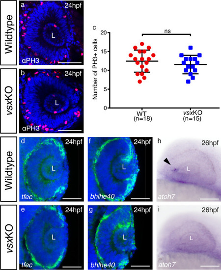 (a, b). Phospho‐histone H3 (PH3) antibody staining was used to evaluate proliferation in WT (a) and vsxKO (b) retinas at 24hpf. (c). Quantification of PH3 positive cells in WT and vsxKO retinas at 24hpf. No significant differences (p>0.05) were detected at that stage between both samples using an unpaired t-test. Data is shown as mean ± SD. (d-g). Confocal representative images of RPE markers tfec (d, e) and bhlhe40 (f, g) by fluorescent in situ hybridization at 24hpf. No major changes in the expression of both genes are detected in vsxKO embryos (e, g) compared to WT samples (d, f), n≥6. (h, i). Lateral view (anterior to the left) from 26hpf WT (h) and vsxKO (i) heads showing the expression of atoh7 gene by colorimetric in situ hybridization. The onset of atoh7 expression is delayed in mutant retinas compared to WT animals. Note an atoh7 positive cell in WT eye at that stage (black arrowhead) n≥12. L: lens, ns: not significant. Scale bar: 50µm . |