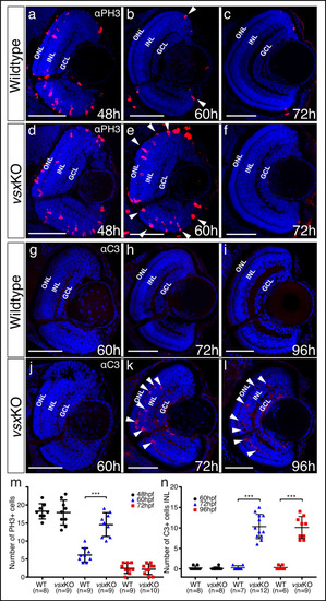 (a-l). Fluorescent in situ hybridization for vsx1 (a-f) and vsx2 (g-l) genes over retina formation in wildtype (a-c, g-i) and vsxKO (d-f) animals (j-l). In wildtype samples, vsx2 is strongly expressed than vsx1 in retinal precursors at earlier developmental stages (a, g) and the opposite effect is observed in INL bipolar cells at later stages (c, i). We found an overexpression of vsx1 at 24hpf (b) and 48hpf (e) and a reduction in the INL expression at 72hpf (c, f) in vsx mutant retinas compared to wildtype. For vsx2, no major differences between wildtype and mutant retinas were detected at 24hpf (g, j), but at 48 and 72hpf we found an increment of vsx2 in the retina and INL, respectively ( |