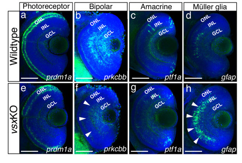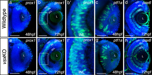 (a-h). Confocal representative images of genes expressed in the INL by fluorescent in situ hybridization at different stages. At 48hpf, no obvious change in the expression of prox1 was detected between WT (a) and vsxKO (e) retinas. At 72hpf, the distribution of prox1 expression in the INL is affected in vsxKO (f and inset f’) compared to WT retinas (b and inset |