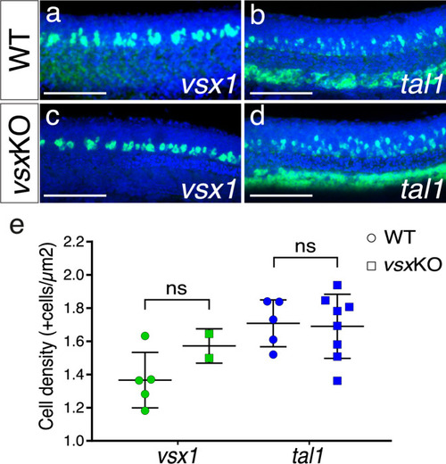 (a-d). Fluorescent in situ hybridization lateral images from 24hpf wildtype (a, b) and vsxKO (c, d) mutants using vsx1 (a, c) and tal1 (b, d) probes to visualize V2a and V2b trunk interneurons, respectively. (e). The density of vsx1 (V2a) and tal1 (V2b) positive neurons was measured in wildtype (n=5 for vsx1 and n=5 for tal1) and vsxKO (n=2 for vsx1 and n=7 for tal1) mutant trunks at 24hpf. Using an unpaired t-test, no significant changes in the number of V2a and V2b neurons was observed between wildtype and vsxKO mutant animals at this stage (p>0.05). Data is shown as mean ± SD. ns: not significant. Scale bar in (a-d): 100 µm. |