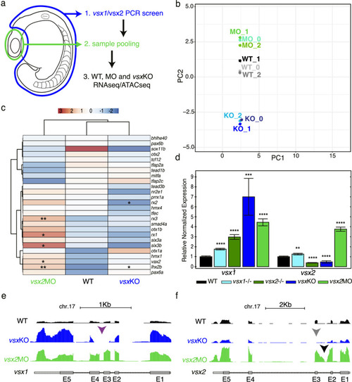 (a) Experimental design. Zebrafish heads including both eyes were mechanically dissected at 18hpf from WT, vsxKO and vsx2MO samples. The trunk and tail (highlighted in blue) were used to extract DNA and genotyping of WT and vsxKO embryos. After genotyping, samples from individual embryos previously dissected were pooled and used for ATAC-seq and/or RNA-seq protocols. (b). RNA-seq PCA evaluation revealing the transcriptomic divergence between WT (black/grey), vsxKO (blue) and vsx2MO (green) samples. (c). Heatmap chart showing gene expression differences between WT, vsxKO and vsx2MO samples of the main retinal transcriptional regulators (*p<0.05; p**<0.01). (d). vsx1 and vsx2 expression levels analysed by real time PCR (n=3) in WT, vsx1∆245, vsx2∆73, vsxKO, and vsx2MO samples. All statistical comparisons are relative to the WT animals using one-way ANOVA (**p<0.01; ***p<0.001; ****p<0.0001; no label = no significant differences). Data is shown as mean ± SD. (e). Graphical visualization of RNA-seq tracks showing vsx1 gene expression in WT, vsxKO, and vsx2MO eyes. In vsxKO samples (blue track), the deletion generated by CRISPR/Cas9 is noticeable due to the lack of reads in part of the third and fourth exons (purple arrowhead). (f). RNA-seq tracks showing vsx2 expression in WT, vsxKO, and vsx2MO samples. In vsxKO samples (blue track), the deletion is evident by the lack of reads in the third exon (grey arrowhead). In vsx2 morphants (green track), a retention of the second intron due to the action of the morpholino can be appreciated. |