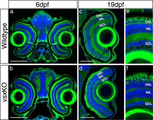 (a-f). Visual system histological sections stained with nuclear marker DAPI and phalloidin-Alexa488 for actin filaments from wildtype (a, c and e, n=5 for both stages) and vsxKO (b, d and |