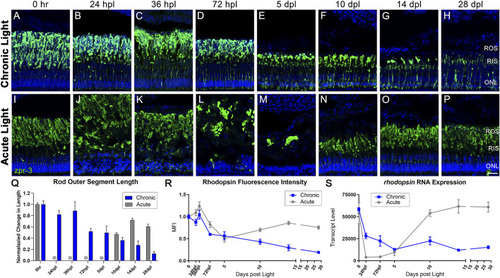 CLL exposure leads to slow rod photoreceptor degeneration, whereas rod photoreceptors are destroyed and replaced in the AL model. Rod PRs were immunolabeled (green) with zpr-3 to mark rod outer segments (ROS) and nuclei were stained blue with TO-PRO-3. |
