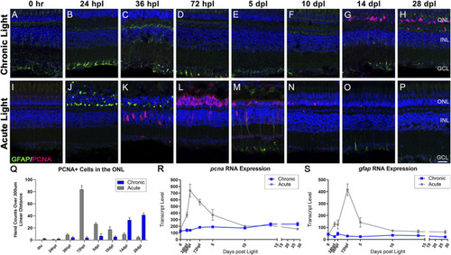 Distinct responses in Müller glia gliosis and proliferation in the CLL and AL models. Müller glia (MG) intermediate filaments were immunolabelled with anti-GFAP antisera (GFAP; green) and cell cycle re-entry was demonstrated with anti-PCNA antisera (PCNA; red). Nuclei were stained with TO-PRO-3 (blue). |