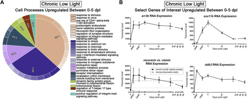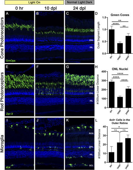 Truncated photoreceptor outer segments recover when zebrafish are transferred back to normal light:dark conditions. Zebrafish were subjected to the CLL lesion protocol for 10 days, then returned to normal light:dark housing conditions and allowed to recover for 14 days. After the 14-day recovery period, retinas were harvested at 24 days post initial light (dpl). |