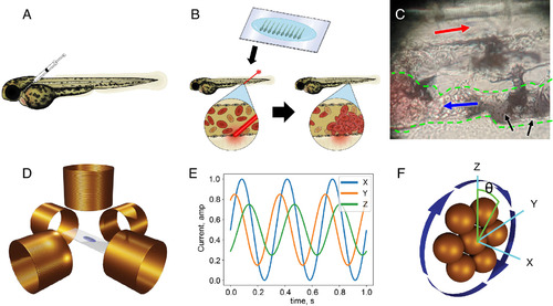 Generation of µwheels. (A) tPA and/or microparticles were infused via the retro-orbital space or PCV using pulled capillary micropipettes. (B) 3 dpf zebrafish larvae were mounted in low melting point agarose on glass coverslips and a pulsed dye laser was used to injure the endothelium of the PCV, resulting in thrombosis. (C) Photograph of µwheels at the site of a clot. Red and blue arrows indicate the direction of blood flow in the arterial and venous systems, respectively. Black arrows indicate the µwheels at the upstream edge of an occlusive thrombus, outlined with green dashes. (D) Zebrafish larvae mounted in low melting point agarose and infused with microparticles were placed in the center of five solenoid coils. (E) A laptop running MuControl software connected to a function generator and amplifier sends alternating currents to the x, y, and z coils. (F) The rotating magnetic field (blue arrows) induced by the coils causes the assembly and translation of the µwheels with steering controlled by the camber angle (θ) of the field relative to the z-axis. |