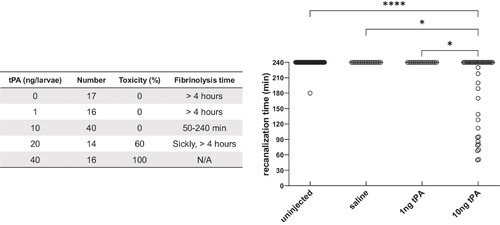 Time to fibrinolysis after infusion of tPA. The PCV of 3 dpf larvae was injured, producing a completely occluding thrombus. This was followed by either no infusion/uninjected (n = 54), infusion of saline (n = 17), 1 ng of recombinant human tPA (n = 16), or 10 ng of recombinant human tPA (n = 40), and then observation for up to 4 h. Only high concentrations of tPA at 10 ng/larvae (~5 to 10× the amount used for human therapy) were able to achieve recanalization in a fraction of larvae within 4 h and without significant toxicity. Lower concentrations of tPA did not recanalize. Bars represent median recanalization time (*P < 0.01, ****P < 0.0001 by Mantel-Cox log-rank testing). |