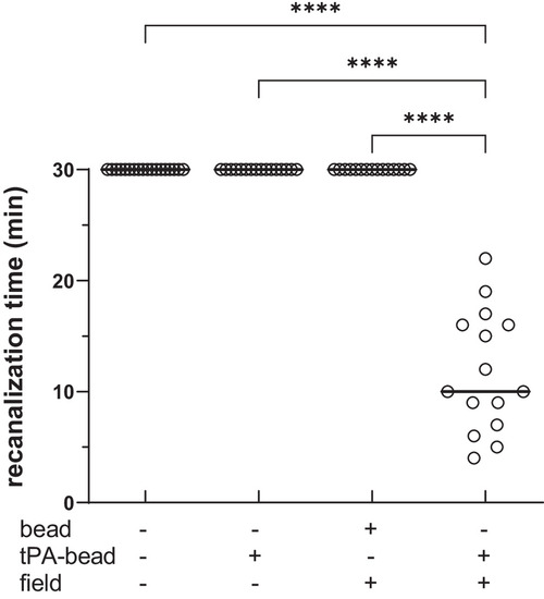 tPA-functionalized µwheels are necessary for recanalization. The PCV of 3 dpf larvae was injured, producing completely occlusive thrombi, followed by no infusion (n = 18), the infusion of microparticles functionalized with ~8.4 pg of tPA (n = 16), unfunctionalized µwheels (n = 15), or tPA-functionalized µwheels carrying ~8.4 pg of tPA (n = 15). The field was applied in rolling mode either until recanalization was observed or a maximum of 30 min. Beyond that point, the coils became too hot and damaged the larvae. Larvae infused with tPA-functionalized µwheels recanalized within 11.8 ± 5.4 min while those infused with non-functionalized µwheels, tPA-functionalized particles without the application of a magnetic field, and uninfused larvae continued to be occluded after 30 min (P < 0.0001 by Mantel-Cox log-rank testing). Bars represent median recanalization time. |