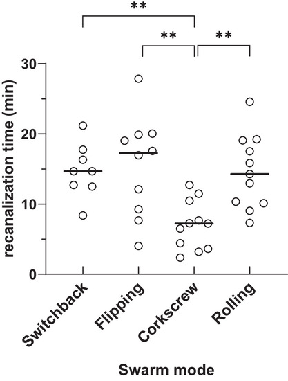 Effect of motion type on recanalization time. 3 nL of tPA-functionalized µwheels containing ~8.4 pg of tPA were infused into 3 dpf zebrafish larvae following injury causing completely occlusive thrombi. Under switchback (n = 8), flipping (n = 10), or rolling (n = 11) modes of movement all recanalized within 30 min, while µwheels under corkscrew (n = 11) movement recanalized within 15 min (**P < 0.01 by Mantel-Cox log-rank testing). Bars represent median recanalization time. |