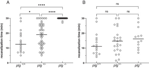 µWheel-mediated recanalization of occlusive thrombi is dependent on plasminogen. (A) CRISPR-mediated genome editing was used to produce a 23 base pair deletion in the plg gene. In the majority of wild-type (n = 18) and heterozygous (n = 43) mutants, µwheels were able to recanalize an occlusive thrombus within 30 min. Conversely, the vast majority of homozygous (n = 20) mutants were unable to do so. Interestingly there was a small, but statistically significant decrease in the percentage of heterozygotes that were able to recanalize, when compared to wild-type siblings. (B) Plasminogen was infused into plg mutant fish [wild-type (n = 16), heterozygous (n = 23), homozygous (n = 12)] and µwheels were able to recanalize the majority of occlusive thrombi within 30 min. Observations were performed prior to genotyping and thus were blinded. Bars represent median recanalization time. (*P < 0.05, ****P < 0.0001 by Mantel-Cox log-rank testing), ns, not significant. |