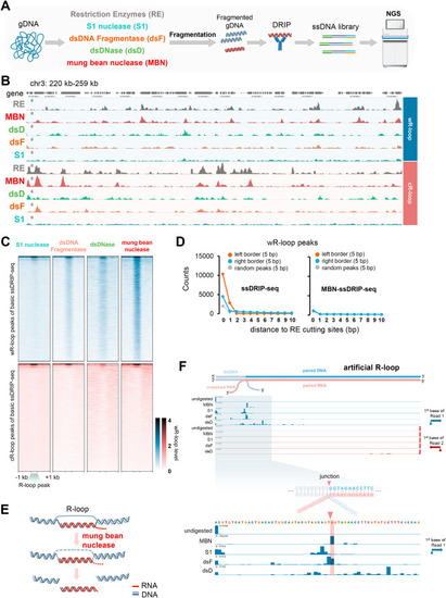 Improvements of ssDRIP-seq by optimizing the genomic DNA fragmentation. A. Schematic of the exploration experiment for the improvement of ssDRIP-seq. Briefly, the gDNA digestion step was first performed by using S1 nuclease, dsDNA Fragmentase, dsDNase, mung bean nuclease, and restriction enzymes. Then gDNA was fragmented by sonication, followed by DRIP, ssDNA library preparation, and sequencing. B. IGV snapshot of Arabidopsis wR-loop (Watson R-loop, with a Watson strand DNA as the unpaired ssDNA) and cR-loop (Crick R-loop, with a Crick strand DNA as the unpaired ssDNA) signals from basic ssDRIP-seq using restriction enzymes (RE, grey) and other modified ssDRIP-seq using mung bean nuclease (MBN, red), dsDNase (dsD, light green), dsDNA Fragmentase (dsF, brown), or S1 nuclease (S1, cyan) for gDNA treatment. C. Heatmaps of Arabidopsis wR-loop signals of modified ssDRIP-seq using S1 nuclease, dsDNA Fragmentase, dsDNase, or mung bean nuclease. The signals around wR-loop (upper, blue) or cR-loop (lower, red) peaks of basic ssDRIP-seq were shown. D. Statistics of boundaries of wR-loop peaks (extended ± 5 bp) from basic ssDRIP-seq (left) or MBN-ssDRIP-seq (right, modified ssDRIP-seq using mung bean nuclease) with different distances from restriction enzyme cutting sites (DdeI, MseI, NlaIII and MboI). 0 bp means overlapping. E. Supposed model of R-loop treatment by mung bean nuclease. F. MBN-ssDRIP-seq result of artificial half R-loop (seen in Fig. S1H). The artificial R-loop was first treated with mung bean nuclease (MBN), S1 nuclease(S1), dsDNA Fragmentase (dsF), or dsDNase (dsD), followed by DRIP and ssDNA library preparation. IGV snapshot showed the counts of the first bases of Watson (blue) and Crick (red) reads. The junction and expected boundaries was marked by red triangle and red shadow respectively. |