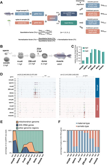 R-loop landscapes during parental-to-zygotic transition. A. Schematic of the quantification method used in ULI-ssDRIP-seq. B. Schematic of early developmental stages examined in this study, including sperm, oocyte, 4-cell, 256-cell, dome stages and dorsal muscle (marked with red circle) from adult fish. Hours post fertilization, hpf. C. Relative levels of total R-loops in the nuclear genome from two biological replications of oocyte, sperm, 4-cell, 256-cell, dome, and muscle groups respectively. D. IGV snapshots of wR-loop and cR-loop signals from oocytes, sperms, 4-cell, 256-cell, dome embryos, and muscles (T1). E. Percentages of ULI-ssDRIP-seq reads from two biological replications of oocyte, sperm, 4-cell, 256-cell, dome, and muscle groups, mapped to the mitochondrial, 45S rRNA genes, or other genomic regions. F. Percentages of ULI-ssDRIP-seq reads from two biological replications of oocyte, sperm, 4-cell, 256-cell, dome, and muscle groups, mapped to maternal-type or somatic-type 45S rRNA genes. |