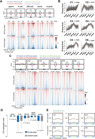 Characteristics of R-loop dynamics during early development. A. Metaplots (upper) and heatmaps (lower) of AT or GC skew around R-loop peaks of sperm, 4-cell, 256-cell, dome and muscle groups. B. Fuzzy cluster analysis of R-loop signals by using Mfuzz. Line plots show ULI-ssDRIP-seq signals, with individual loci (grey lines) and values of the cluster center (orange line). The count of R-loop peaks from each cluster is shown as “n”. R-loop peak locations of each cluster are shown in Table S4. C. Metaplots (upper) and heatmaps (lower) of AT or GC skew around R-loop peaks of clusters 1 to 6 shown in Fig. 4B. D. Box plot of CG methylation levels (SRP020008) on R-loop peaks (blue) or random peaks (grey) in sperm, muscle, and 4-cell, 256-cell, dome/sphere stage embryos. As sphere-stage is very close to dome stage, the CG methylation pattern at sphere stage is analyzed with R-loop peaks at dome stage. P values were calculated using Mann-Whitney U test. E. Metaplots of ATAC-seq signals (GSE101779) around six R-loop clusters (Fig. 4B) in zebrafish embryos at 256-cell or dome stage. |
