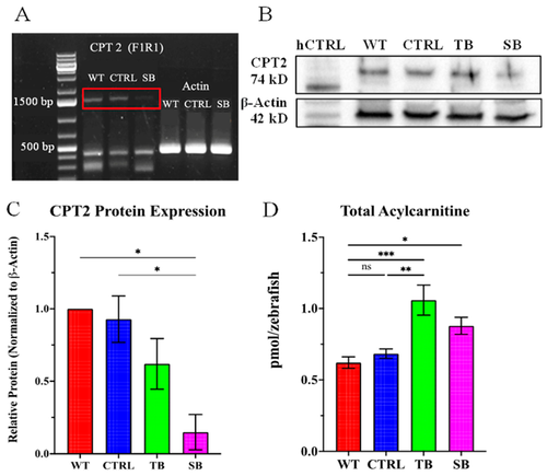 Evaluation of morpholino CPT2 knockdown. (A). PCR amplification of full-length cpt2 run on 1% agarose gel. Actin was used as reference and control. N = 30 fish per condition. Red box indicates the expected cpt2 PCR product. (B). Representative Western blot for CPT2 expression in control and MO knockdown zebrafish. Human CPT2 lysate (hCPT2) was used as positive control. Actin was used as protein loading control. (C). CPT2 protein expression in MO knockdown zebrafish relative to WT. Protein levels were normalized to loading control β-actin. N = 200 fish per condition for each trial. Error bars = standard error of difference of 0.19 as determined by ordinary one-way ANOVA. (D). Total fatty-acylcarnitine expression evaluated using LC-MS/MS. N = 30 fish per condition for each of five trials. Error bars = SEM. (A–D). WT = wildtype zebrafish; CTRL = control, scrambled MO-injected zebrafish; TB = translation blocking MO-injected zebrafish; SB = splice blocking MO-injected zebrafish. * p ≤ 0.05, ** p ≤ 0.01, *** p ≤ 0.001, ns = not significant. |