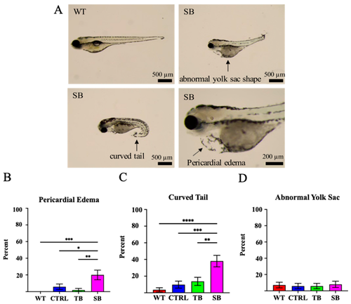 Phenotypic assessment of CPT2 knockdown larvae. (A). CPT2 knockdown larvae at 5 dpi presented with several predominant phenotypic differences such as pericardial edema, curved tail, and abnormal yolk sac shape. Representative images of SB-injected phenotypes (SB) and wildtype (WT) comparison are shown. Scale bar = 500 µm and 200 µm, respectively. (B–D). Percent of qualitative phenotypic differences was compared between conditions. (A–D). WT = wildtype zebrafish; CTRL = control, scrambled MO-injected zebrafish; TB = translation blocking MO-injected zebrafish; SB = splice blocking MO-injected zebrafish. N = 50 fish per condition. * p ≤ 0.05, ** p ≤ 0.01, *** p ≤ 0.001, **** p ≤ 0.0001. Error bars = SEM. |