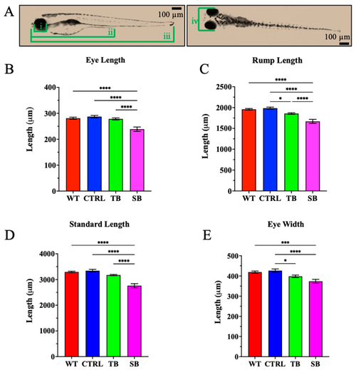 Body development in CPT2 knockdown larvae. (A). Measurements of head and body development were obtained using four consistent measurements. (i) Eye length, (ii) rump length, (iii) standard length, (iv) eye width. Scale bar = 100 µm. (B–E). Measurements for eye length, rump length, standard length, and eye width. (B–E). WT = wildtype; CTRL = control, scrambled MO-injected zebrafish; TB = translation blocking MO-injected zebrafish; SB = splice blocking MO-injected zebrafish. N = 50 fish per condition. * p ≤ 0.05, *** p ≤ 0.001, **** p ≤ 0.0001. Error bars = SEM. |