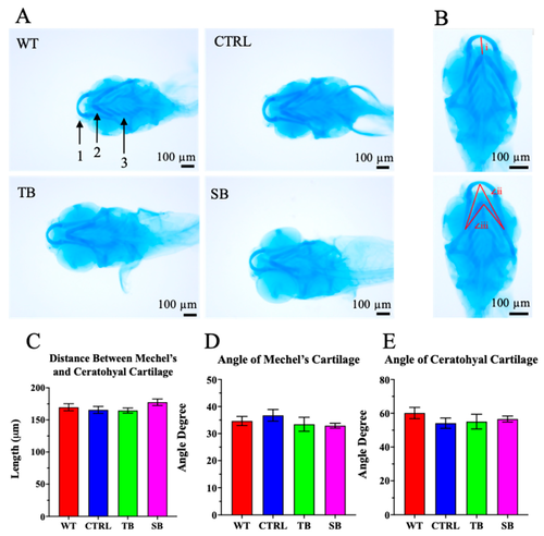Cartilage development in CPT2 knockdown larvae. (A). Alcian blue stain was performed on 5 dpi larvae to evaluate cartilage development. Areas of focus were Mechel’s cartilage (1), ceratohyal cartilage (2), and ceratobranchial cartilage i–v (3). Scale bar = 100 µm. (B). Cartilage development was assessed on distance between Mechel’s and ceratohyal cartilage (i), angle of Mechel’s cartilage (∠ii), and angle of ceratohyal cartilage (∠iii). (C,D). Quantification of cartilage measurements. (A–E). WT = wildtype; CTRL = control, scrambled MO-injected fish; TB = translation blocking MO-injected zebrafish; SB = splice blocking MO. N ≤ 11 zebrafish per condition. Error bars = SEM. |