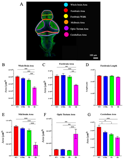 Brain development in CPT2 knockdown larvae. (A). Dissected zebrafish brain immunostained with acetylated tubulin. Schematic map of brain regions that were measured. Scale bar = 100 µm. (B–G). Quantification of area and length measurements from dissected and acetylated tubulin-stained brains. WT = wildtype zebrafish; CTRL = control, scrambled MO-injected zebrafish; TB = translation blocking MO-injected zebrafish; SB = splice blocking MO-injected zebrafish. N = 8–16 zebrafish brains per condition. * p ≤ 0.05, ** p < 0.01, *** p < 0.001, **** p < 0.0001. Error bars = SEM. |