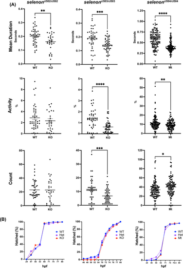Selenoprotein-N deficient zebrafish embryos present with impaired spontaneous contractions. Spontanous tail and trunk contractions of zebrafish embryos were recorded and quantified at 24 hpf in SelN homozygous KO selenoncl502 (N = 45 and 29), selenoncl503 (N = 43,48), and homozygous mutant (Mt) selenoncl504 (N = 131,116) and their correspodent WT controls. (A) Mean duration of spontaneous contractions, percent time of contraction activity, and total number of contractions are reported in each line. “*” = p < 0.05, “**” = p < 0.01, “***” = p < 0.001, “****” = p < 0.0001. (B) WT, heterozygous and homozygous embryos were observed for hatching activity and recorded up until 80 hpf (N = 41–100 WT, 92–134 heterozygous, and 56–93 homozygous mutant embryos per line) PHENOTYPE: