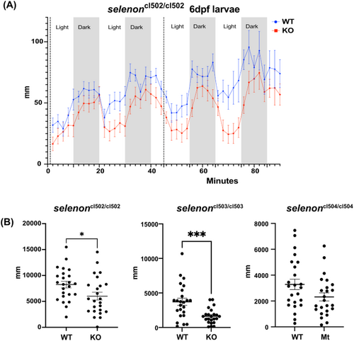 Selenon-deficient zebrafish larvae show decreased activity. (A) 6 dpf WT (blue) and homozygous selenon-KO selenoncl502/cl502(red) zebrafish larvae were tested for swim activity using an activity monitor and a 90-minute protocol that included vibration (dotted lines) and cycles of alternating light (non-shaded areas) and dark (shaded areas) periods. (B) Quantification of activity assays of WT and homozygous selenon-mutant lines shows decreased total distance swum in SelN-deficient zebrafish larvae when compared to their correspondending WT controls (N = 24). “*” = p < 0.05, “***” = p < 0.001 PHENOTYPE: