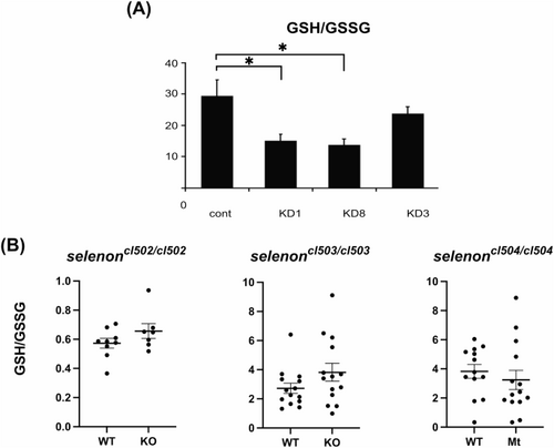 Glutathione homeostasis is altered in cell models of SELENON-CM. (A) Selenon Knock Down (KD) cell lines show decreased gluathione ratio (GSH/GSSG) when compared to WT control. (B) GSH/GSSG ratio were measured in 6 dpf selenoncl502 (N = 9 and 7), selenoncl503 (N = 14), and selenoncl504 (N = 13 and 14) zebrafish lines. “*” = p < 0.05, “**” = p < 0.01, “***” = p < 0.001 PHENOTYPE: