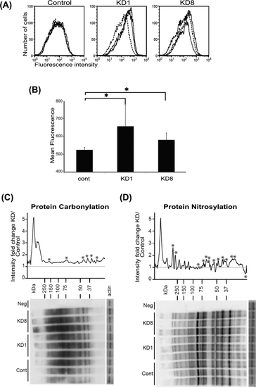 Selenon knock down cells present increased ROS levels when compared to control. (A) Flow cytometry assay of CM-H2DCFDA stained cells to measure ROS levels in selenon knock down (KD1 and KD8) and WT control cells. (B) Quantification of fluorescence from (A) reveals significant increase of ROS levels in selenon KD cell lines when compared to control. (C) Immunoblotting of protein carbonylation and (D) nytrosylation demonstrate increased levels in selenon KD when compared to control cells |