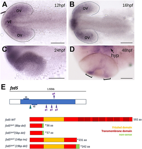 fzd5 is expressed in the optic primordium throughout eye formation. (A-D) Dorsal (A-C) or ventral (D) views, with anterior to the left, at the stage indicated in each panel. Dotted outlines in A and B highlight the optic vesicles. Brackets in D highlight the ciliary marginal zone (CMZ). (E) Schematic of the transcription activator-like effector nucleases (TALENs; t1 and t2) and guide RNAs (g1 to g4) used to generate the fzd5 mutant alleles for this study, and their predicted protein products. aa, amino acids; hpf, h post-fertilisation; hyp, hypothalamus; ov, optic vesicles; vt, ventral telencephalon. Scale bars: 100 µm. EXPRESSION / LABELING: