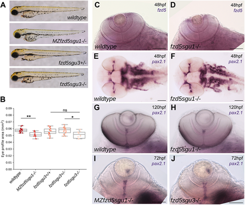 Subtle eye defects in fzd5sgu1, MZfzd5sgu1 and fzd5sgu3 embryos. (A) MZfzd5sgu1 and fzd5sgu3 3 days post-fertilisation (dpf) larvae morphology compared to that of wild-type and heterozygote siblings. (B) Quantifications of projected eye area in the genotypic groups from A. Box plots represent the median and 25-75th percentiles; whiskers indicate the range of the data. Each data point represents one eye. A pairwise Tukey HSD post-hoc test revealed statistically significant eye size differences between the wild-type and the MZfzd5sgu1 group (P=0.006748), and between the fzd5sgu3 homozygote and heterozygote group (P=0.01591). ns, not significant; *P<0.05, **P<0.01. (C-J) Expression of fzd5 in the CMZ (C,D) and pax2.1 in the optic stalk/optic nerve (E-J) in fzd5sgu1 (D,F,H), MZfzd5sgu1 (I) and fzd5sgu3 (J) embryos compared to wild-type controls (C,E,G). Embryo age is indicated in each panel. Scale bars: 100 µm. PHENOTYPE: