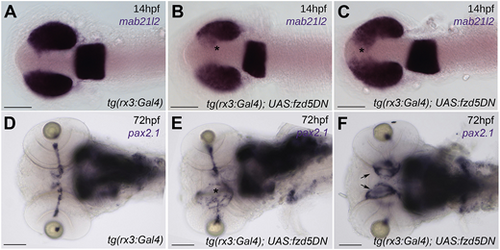 Overexpression of a dominant-negative form of Fzd5 in the optic primordium results in eye defects. (A-C) 14 hpf embryos stained with the pan retinal marker mab21l2 showing incomplete optic vesicle evagination in tg(rx3:Gal4);UAS:fzd5DN [asterisks in B,C, compare with wild-type expression pattern in tg(rx3:Gal4) controls in A]. (D-F) pax2.1 expression at 72 hpf highlighting optic nerve defects and optic disc coloboma in tg(rx3:Gal4);UAS:fzd5DN (E, asterisk; F, arrows) compared to tg(rx3:Gal4) controls (D). Panels show dorsal (A-C) or ventral (G-I) views of embryo heads with anterior to the left. Scale bars: 100 µm. |