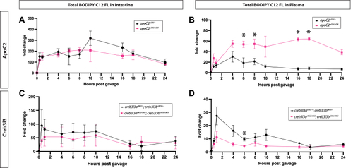 The loss of Creb3l3 may affect lipid secretion from the enterocyte. A: Fluorescent signal of BODIPY-C12 within intestinal homogenate over 24 h post gavage shows no significant difference between |