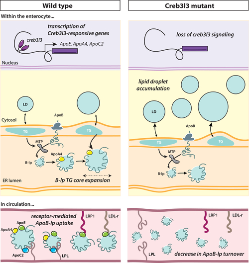 Summary of results and hypothetical model. Creb3l3 signaling activates Creb3l3-responsive genes such as ApoC2, ApoE, and ApoA4. We found that loss of Creb3l3 results in an increase of cytoplasmic lipid droplets in the enterocytes likely due to the loss of ApoA4. It is speculated that ApoA4 is responsible for expanding the size of the ApoB-lp through the addition of triglyceride potentially in poorly understood post ER steps. If enterocytes are unable to enlarge particles, the enterocyte may be directing excess lipid to cytoplasmic lipid droplets for storage. In circulation, ApoE facilitates the uptake of B-lp by peripheral tissues. In our study, we hypothesize that the increase of ApoB-lp half-life, or decrease of ApoB-lp turnover, is a direct result of the loss of ApoE from the ApoB-lp particle. ApoB-lp, apolipoprotein-B–containing lipoprotein; B-lp, ApoB-containing lipoprotein; Creb3l3, cAMP-responsive element-binding protein 3–like 3; ER, endoplasmic reticulum; LDL-r and LRP1, members low-density lipoprotein receptor family; LPL, lipoprotein lipase; MTP, microsomal triglyceride transfer protein; TG, triglyceride. |