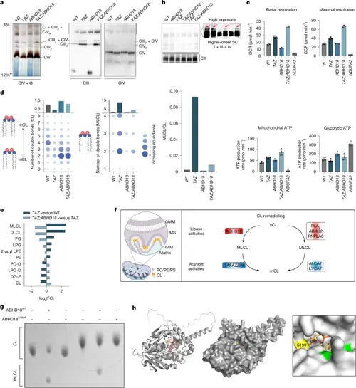 ABHD18 regulates MRC assembly and generates MLCL from nCL. a, IGA assay (CI + CIV; n = 2 biological replicates) and BN–PAGE immunoblots of isolated mitochondria from the indicated HAP1 cells. Blots were probed for CIII (UQCRC2) and CIV (COX IV + MTCO1; n = 3 biological replicates). b, BN–PAGE of the indicated HAP1 cell lines. Inset: long exposure to visualize higher-order supercomplexes (SC, mtCOX-1). c, Seahorse Cell Mito stress test in HAP1 cell lines. Box plots show respiratory parameters: basal respiration, maximal respiration, mitochondrial ATP generation and glycolytic ATP generation. Data are presented as mean ± s.d. of n = 4 technical replicates. d, Effect of TAZ-KO, ABHD18-KO and TAZ;ABHD18 double-KO on CL and MLCL abundance and composition determined by lipidomic profiling. Dot plots show CL (left) and MLCL (middle) abundance in WT and mutant HAP1 cells. The y axes show the aggregate abundance of all species with the same number of double bonds, regardless of carbon chain length, with summary bar plots shown above. Right, bar plot of MLCL/CL ratios across HAP1 cell lines e, Cellular phospholipid composition determined by lipidomics in TAZ-KO and TAZ;ABHD18 double-KO clones. The bar plot shows changes in abundance across lipid classes in TAZ-KO versus HAP1 WT and TAZ;ABHD18 double-KOs versus TAZ-KO cells (n = 3 mutant clones, nWT = 4). Only classes that are deregulated in TAZ-KO cells are shown (Padj < 0.05, determined by one-way ANOVA followed by Tukey’s honest significant difference). f, Schematic illustrating the CL biosynthesis pathway. OMM, outer mitochondrial membrane; IMS, inner mitochondrial space; IMM, inner mitochondrial membrane; PC, phosphatidylcholine; PE, phosphatidylethanolamine; PS, phosphatidylserine. g, Effect of recombinant ABHD18 on purified CL. TLC using purified ABHD18 protein and purified CL(14:1) (lower CL spot) or CL(16:0–18:1) (upper CL spot) shows that ABHD18WT but not ABHD18S199A can produce MLCL from CL. h, In silico molecular docking simulation using the GROMACS package of ABHD18 and a MLCL molecule showing the S199 residue (yellow) and other serine residues (green). Part h was reproduced from https://alphafold.ebi.ac.uk under a CC-BY 4.0 license. |